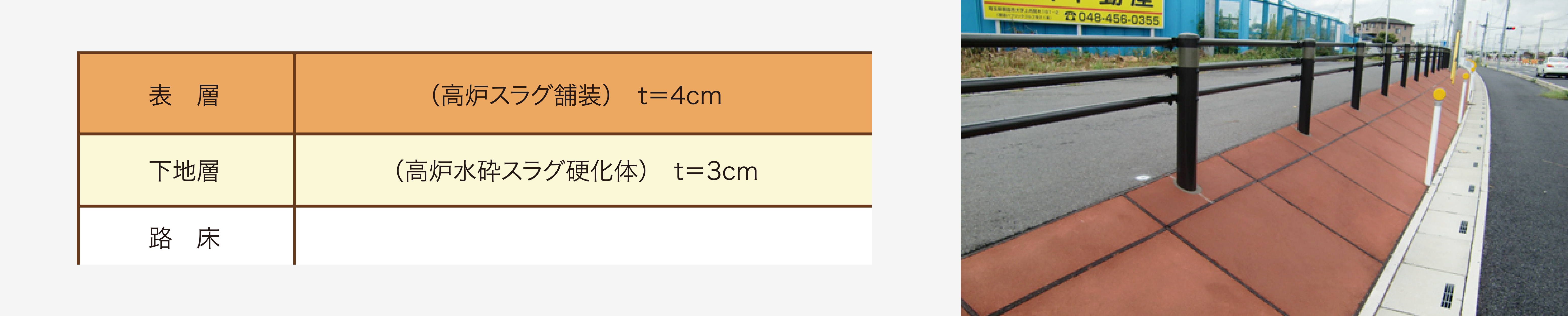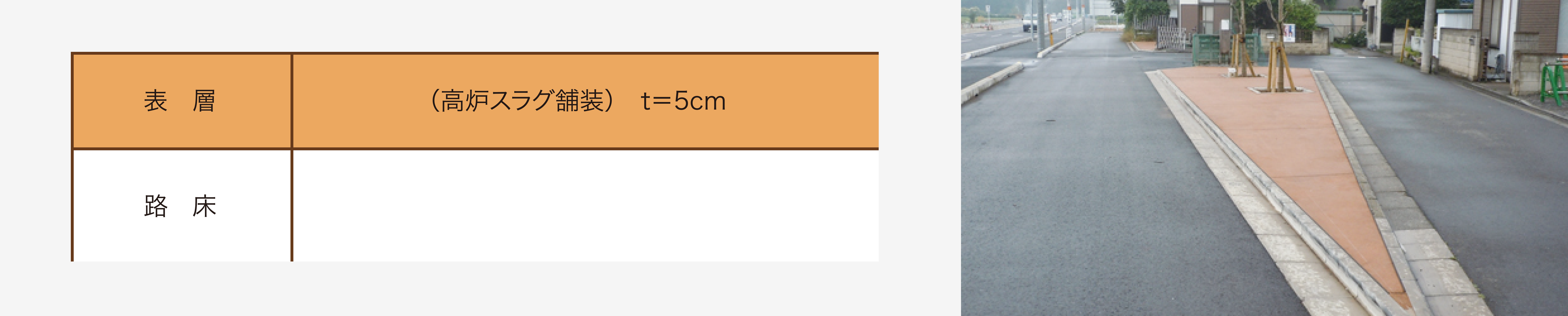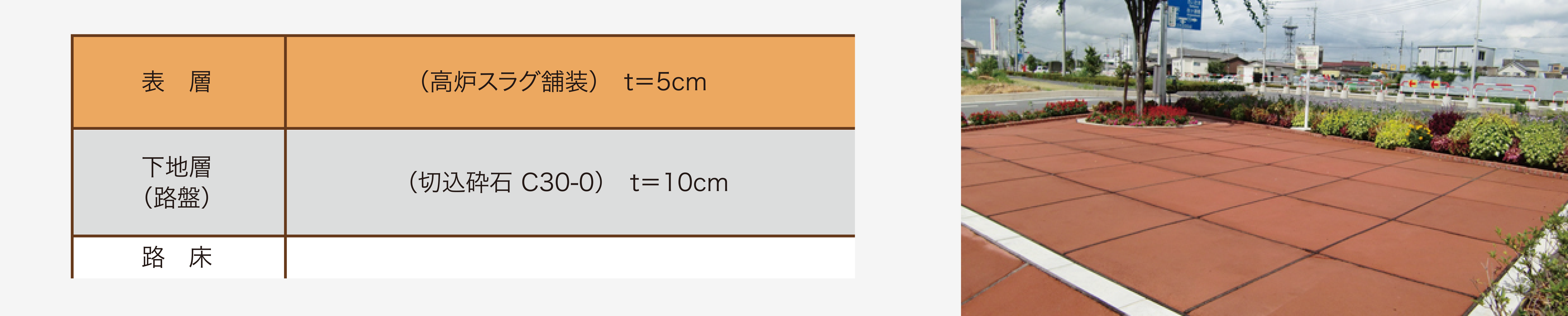 - 表層及び下地層は、15年以上の施工実績を持つ透水性高炉スラグ舗装「カラーサンド」と同じ材料を採用している為、材料の品質性能は実証済です。